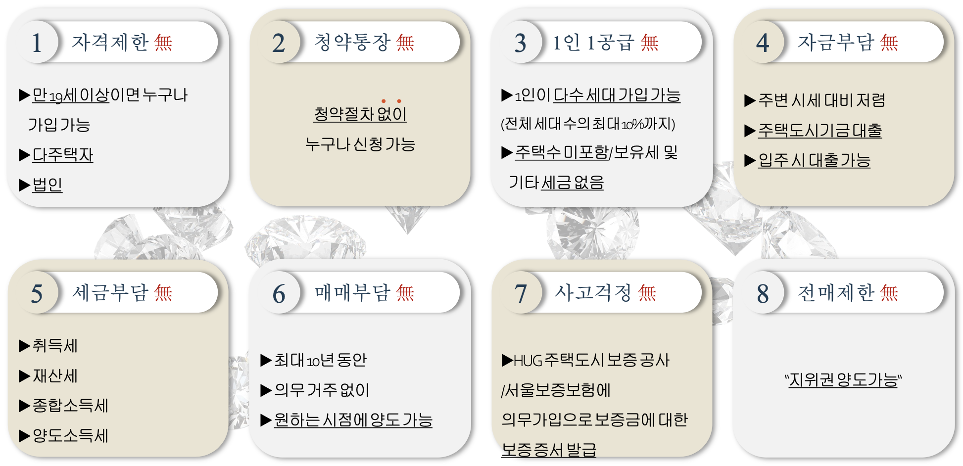 10년 동안 안정적으로 거주가 가능하며, 보유세·양도세·취득세 면제 혜택이 있습니다. 임대 종료 후 최초 분양가로 분양 전환이 가능하며, 전매 제한이 없어 자유로운 지위 양도가 가능합니다.