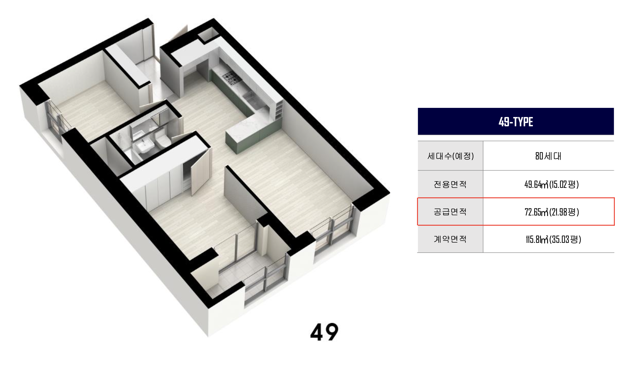 44㎡, 49㎡, 59㎡, 84㎡ 타입으로 공급되며, 특히 84㎡는 방 3개, 욕실 2개, 드레스룸, 팬트리, ㄱ자형 주방이 포함된 특화 설계로 가족 단위 실수요자에게 인기가 높습니다. 소형부터 중형까지 다양한 평면 구성이 마련돼 수요층을 폭넓게 수용할 수 있습니다.