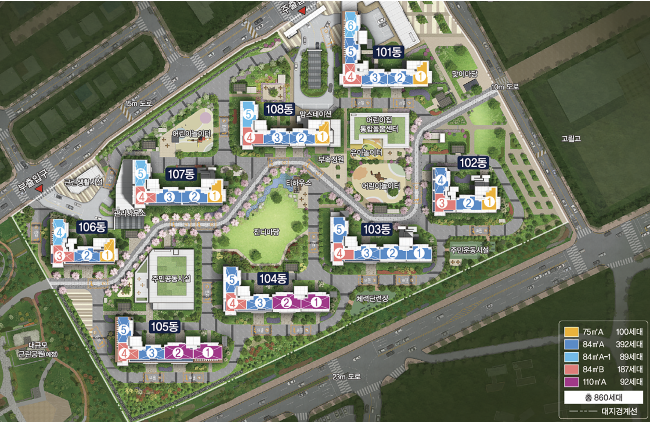 단지 바로 앞 대형 근린공원과 어린이공원 조성이 예정돼 있으며, 경안천 수변공원과 봉두산이 가까이 있어 쾌적한 녹지 환경을 누릴 수 있습니다. 차량 없는 공원형 단지 설계로 보행 안전성이 높아지고, 최대 119m의 넓은 동간 거리를 통해 채광과 통풍은 물론 프라이버시 보호까지 강화됩니다.