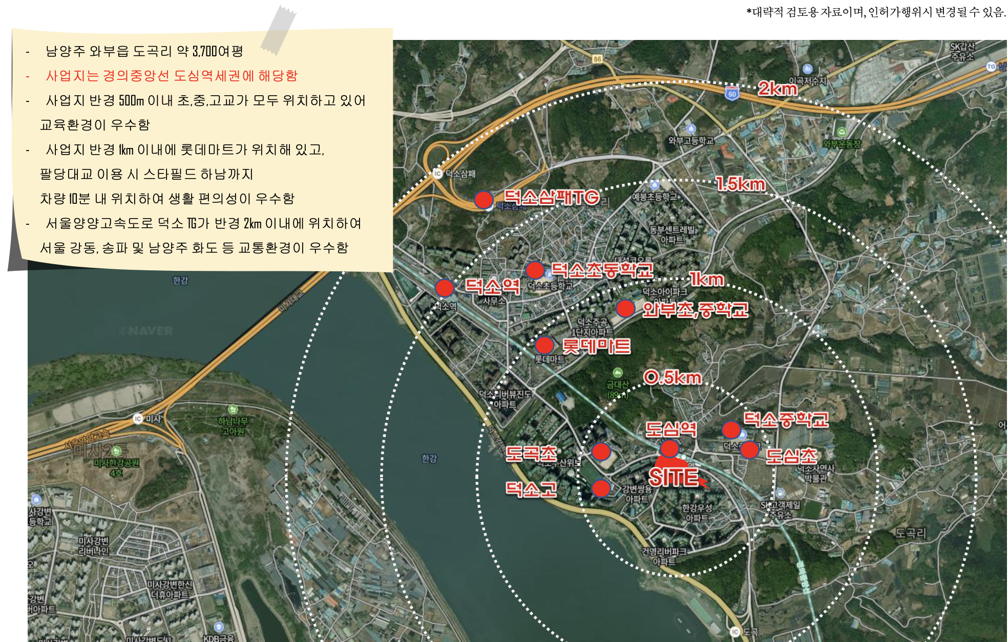 생활 인프라도 잘 갖춰져 있습니다. 반경 1km 내 롯데마트가 있으며 차량 10분 거리에는 하남 스타필드가 위치해 대형 쇼핑 및 문화시설 이용이 가능합니다. 교육환경도 뛰어나 도곡초, 도심초, 덕소중, 덕소고가 반경 500m 내 위치해 있어 자녀들의 안전한 도보 통학이 보장됩니다. 학세권 입지 덕분에 교육을 중시하는 가구에도 적합합니다.
