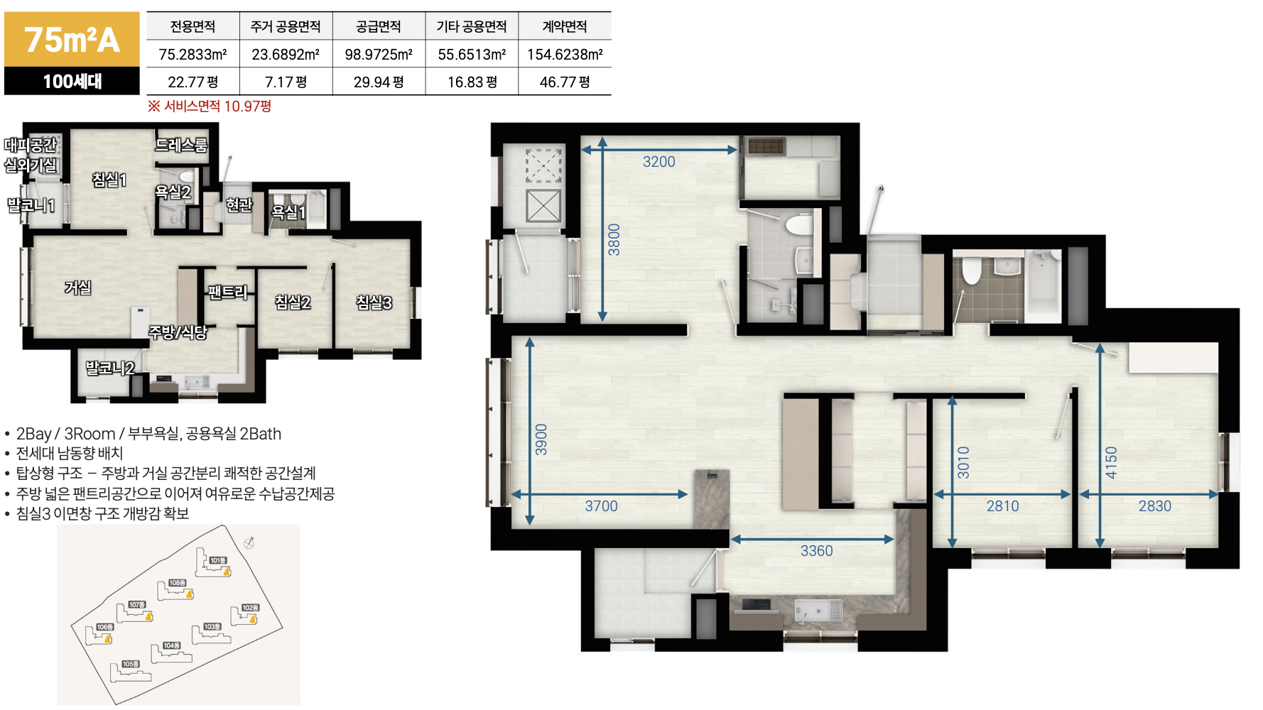 75㎡는 팬트리 특화 설계, 84㎡는 알파룸과 판상형 구조, 110㎡는 대형 드레스룸과 확장형 주방을 제공해 다양한 라이프스타일에 맞춘 선택이 가능합니다. 남향 위주 단지 배치로 채광과 통풍도 극대화되었습니다.