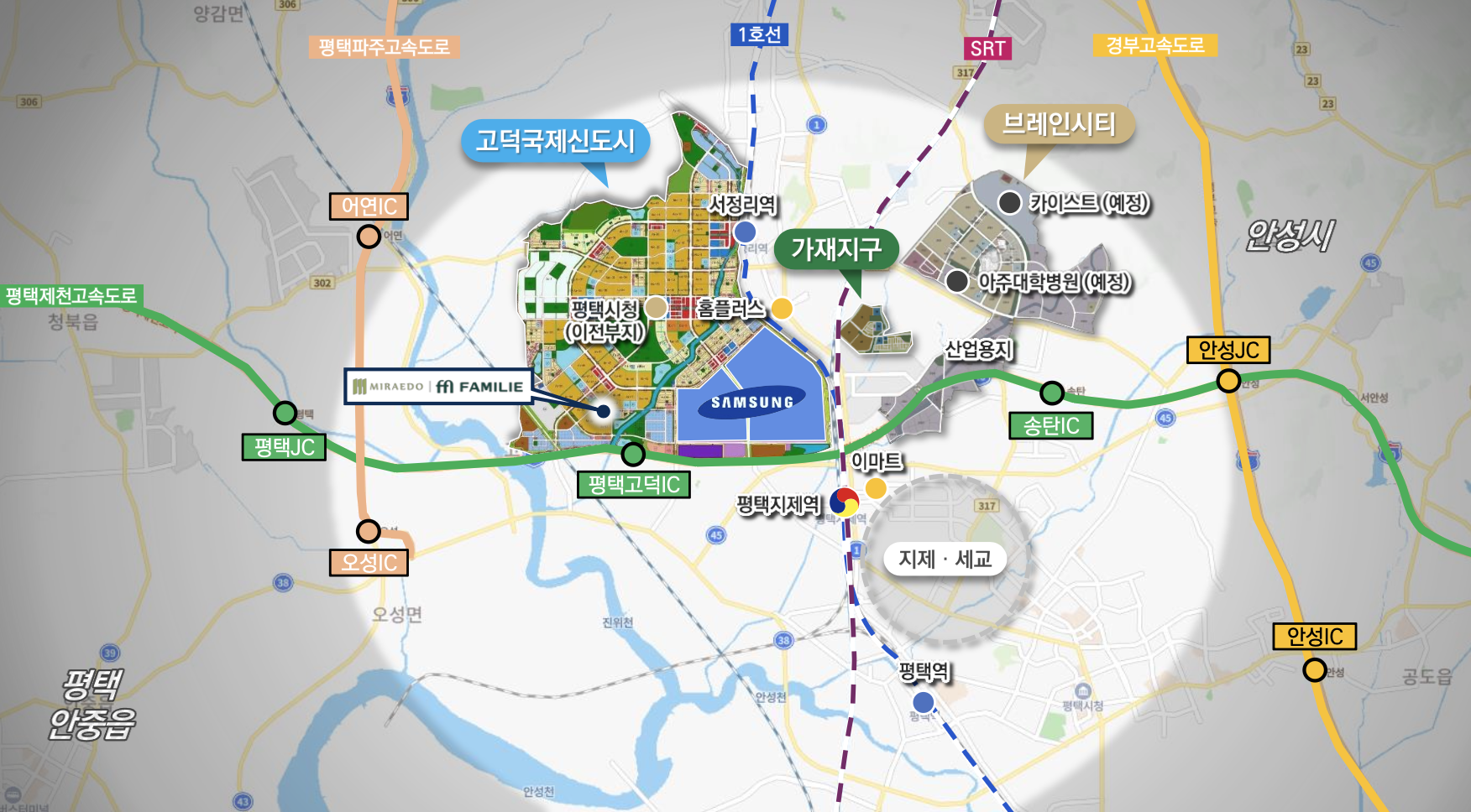 수도권 지하철 1호선 서정리역과 SRT·KTX가 운행되는 평택지제역을 모두 이용할 수 있습니다. 평택지제역은 향후 GTX-A·C 노선이 연장될 예정으로 수도권 전역으로의 접근성이 강화됩니다. 또한 고덕국제신도시 순환 BRT 정류장이 인근에 예정되어 있으며, 평택고덕IC를 통해 평택제천고속도로, 경부고속도로로 연결이 수월해 차량 이동도 편리합니다.