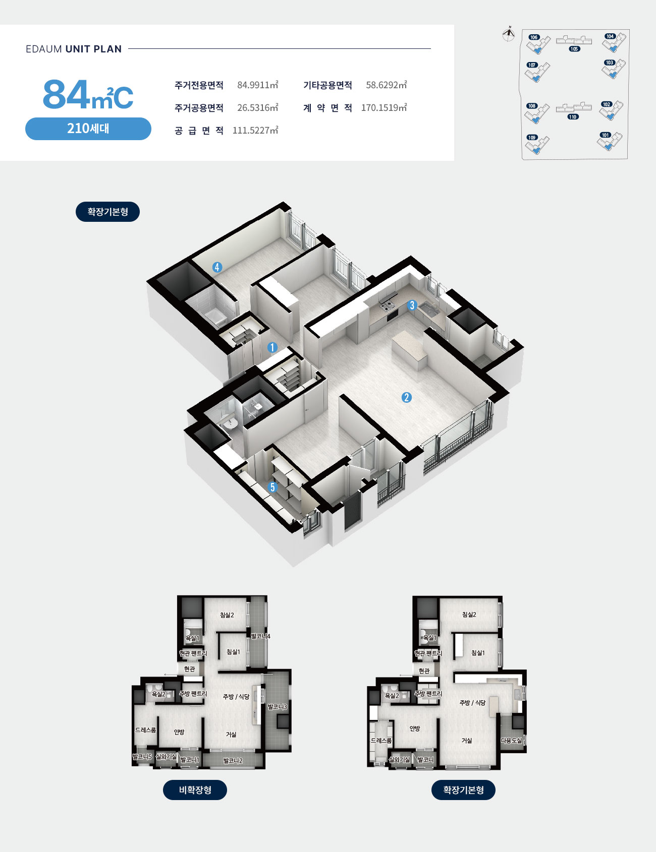 단지는 남향 위주 배치와 4Bay 판상형 설계(일부 제외)를 적용해 채광과 통풍을 극대화했습니다. 84㎡형은 침실 4개, 팬트리, 드레스룸을 포함해 공간 활용성이 높고, 101㎡형은 개방감 있는 거실 구조가 돋보입니다. 세대당 1.5대의 넉넉한 주차공간과 지상 차량 없는 단지 구조로 안전한 보행 환경을 제공합니다.