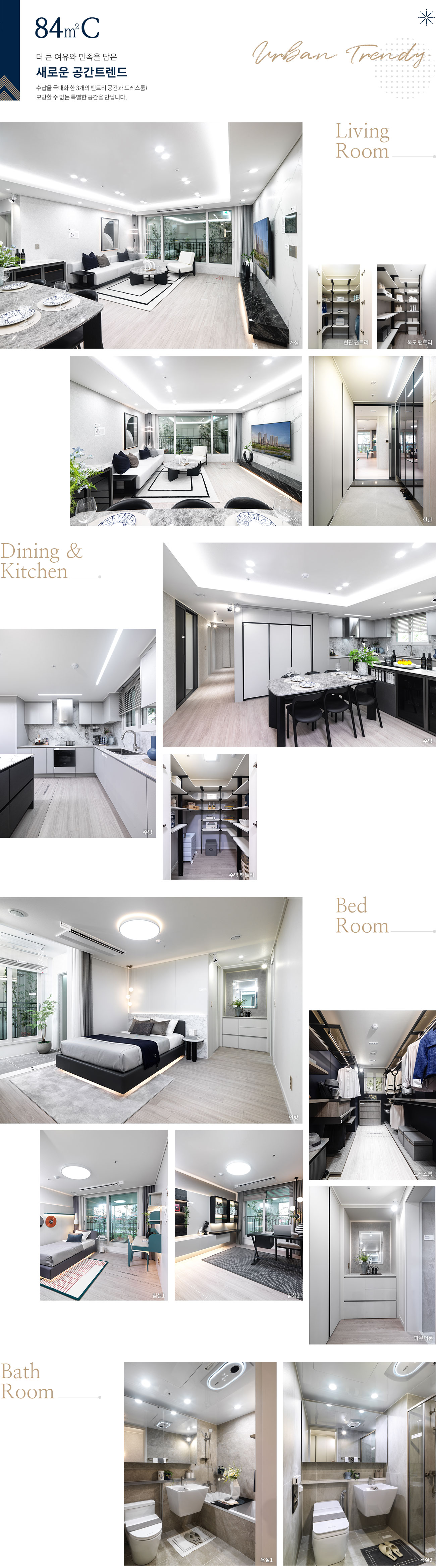 인테리어는 고급 자재와 세련된 색감을 적용해 품격 있는 주거공간을 구현했습니다. 주방은 효율적인 동선을 고려해 실용성과 심미성을 모두 확보했고, 거실은 와이드형 창호를 적용해 개방감을 강조했습니다. 욕실에는 건식 구조와 고급 위생도기를 적용해 쾌적함을 더했습니다.