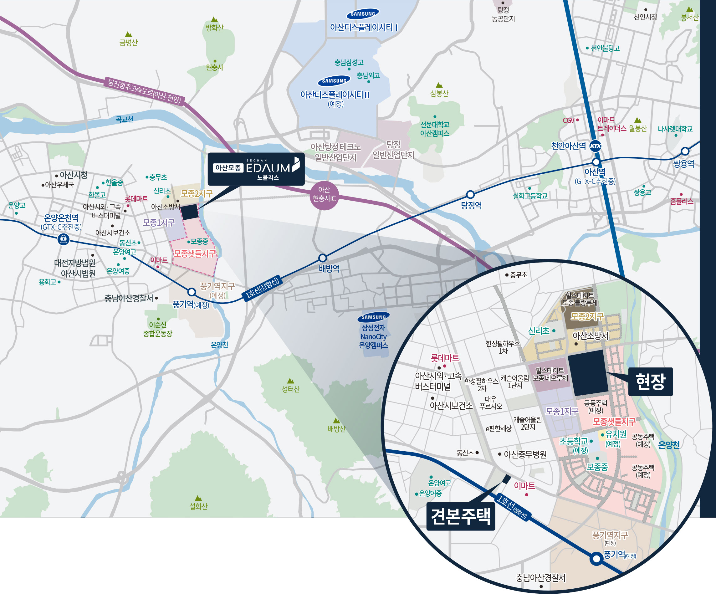 단지 주변에는 롯데마트, 이마트, CGV, 아산충무병원, 아산시청 등 생활 인프라가 밀집해 있으며, 신리초, 모종중, 한올중·고, 온양여중·여고 등 교육시설도 인접해 있습니다. 또한 모종동 학원가 접근성이 좋아 학부모 수요자들에게 높은 평가를 받고 있습니다.