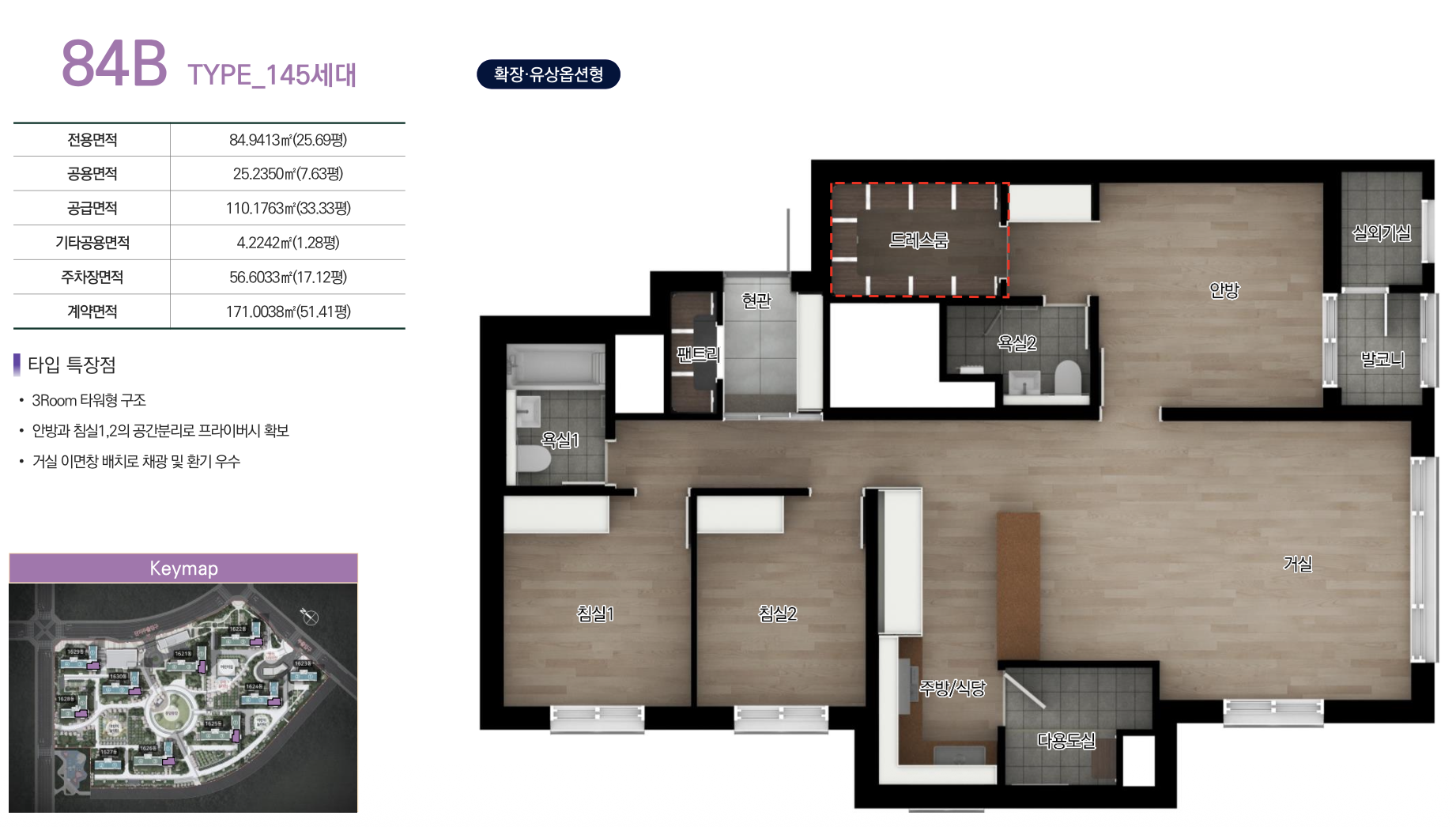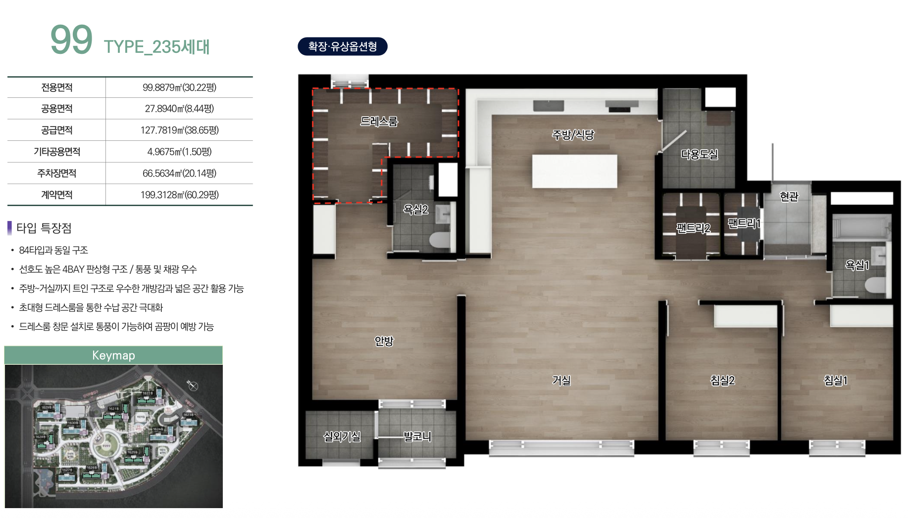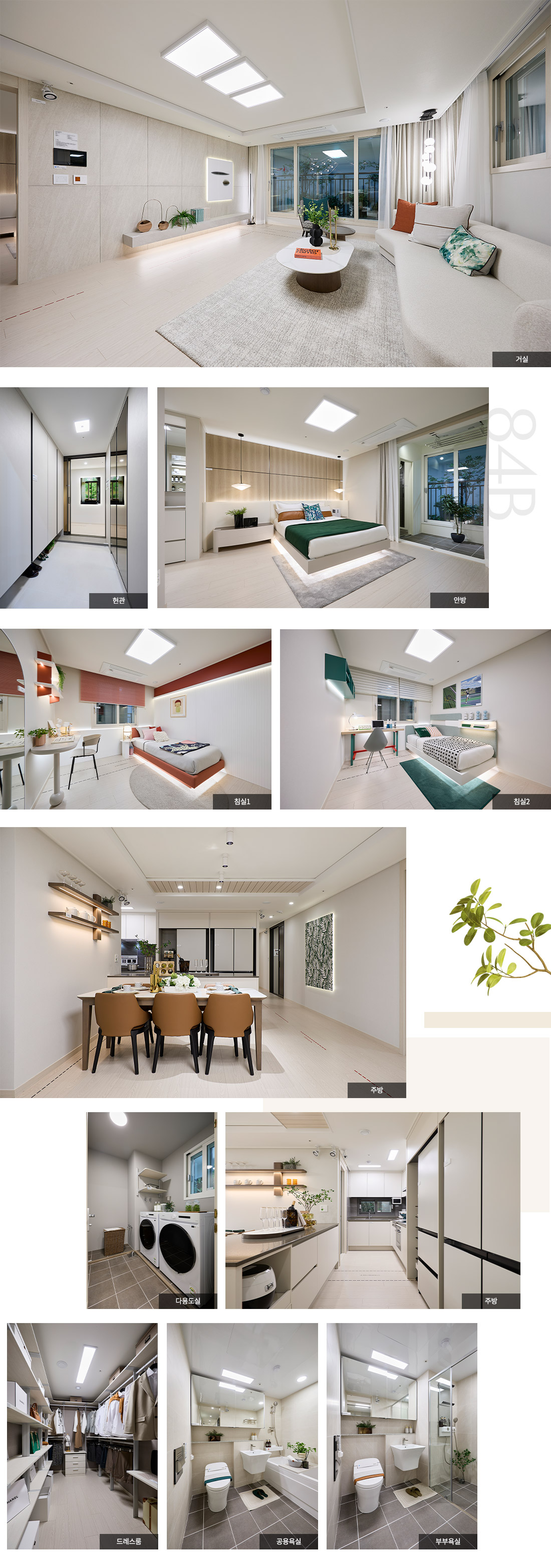 84㎡A, 84㎡B, 99㎡ 세 가지 타입으로 구성되었으며, 전 세대가 4Bay 판상형 구조로 설계되었습니다. 거실과 주방의 효율적인 동선과 넉넉한 수납공간, 드레스룸과 팬트리 등 실용적인 구조가 특징입니다. 실거주 중심의 설계로 가족 단위 수요자에게 적합한 평면 구성입니다.