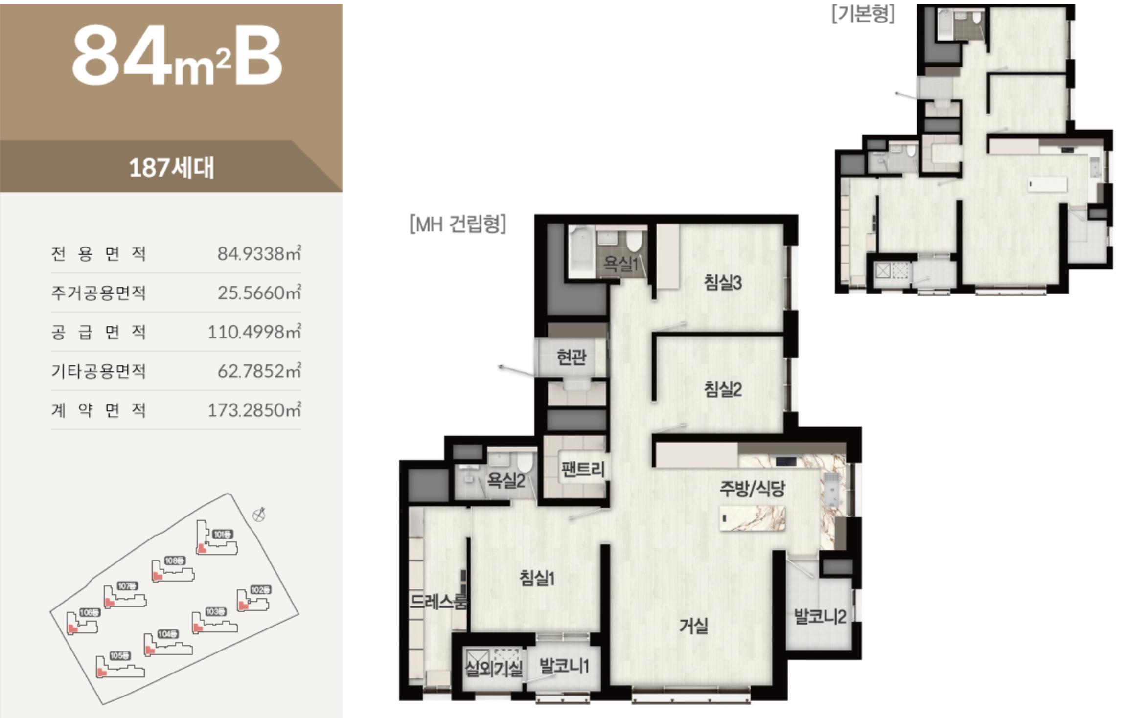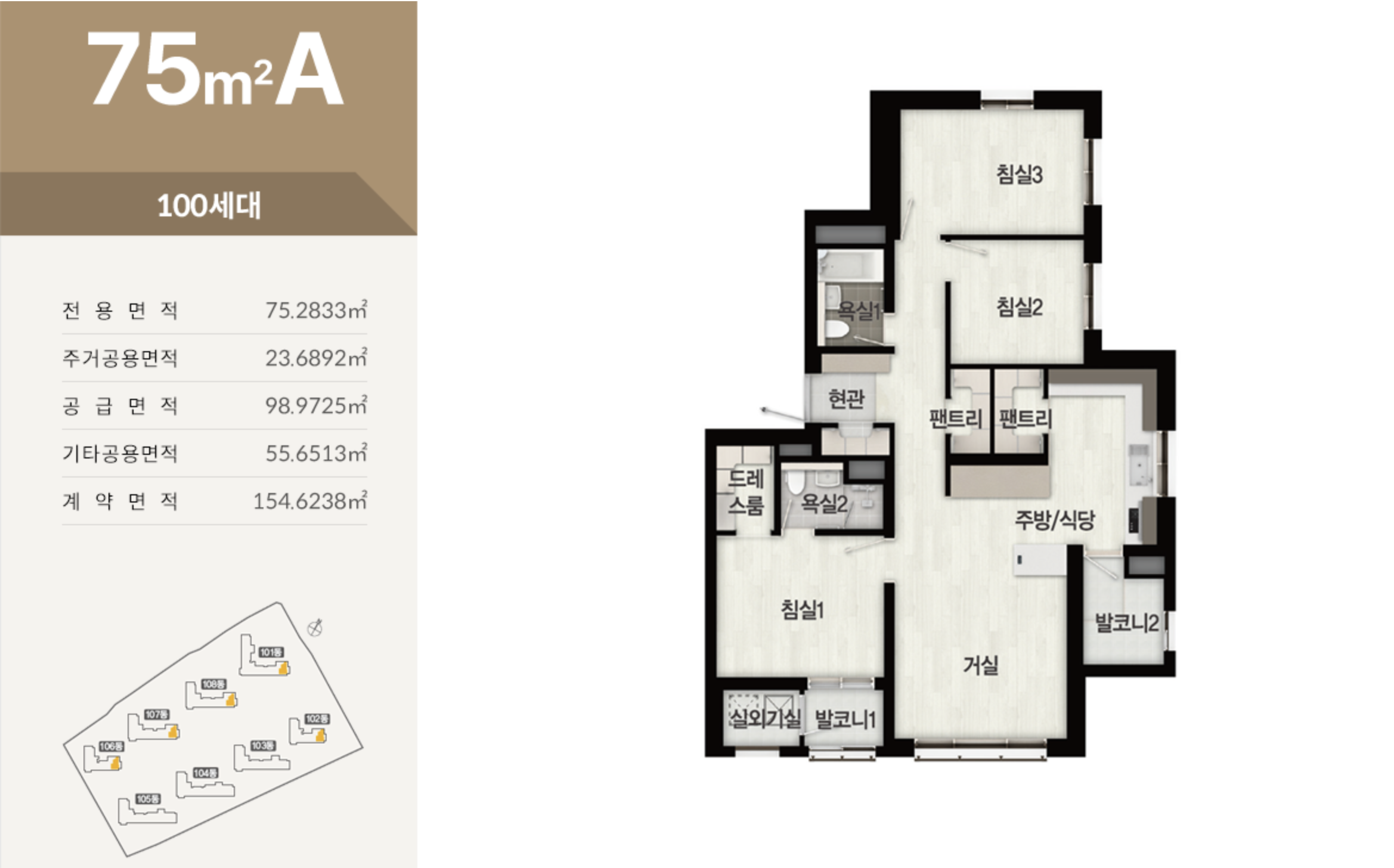 남향 위주의 단지 배치로 채광과 통풍이 뛰어나며, 4Bay 구조를 적용해 실용성과 개방감을 높였습니다. 75㎡ 타입은 효율적인 실속형 구조로, 84㎡ 타입은 알파룸이 포함된 4Room 구성으로 공간활용이 자유롭습니다. 110㎡ 타입은 대형 주방과 드레스룸, 팬트리, 발코니 확장 등 고급형 설계로 구성되어 있습니다.