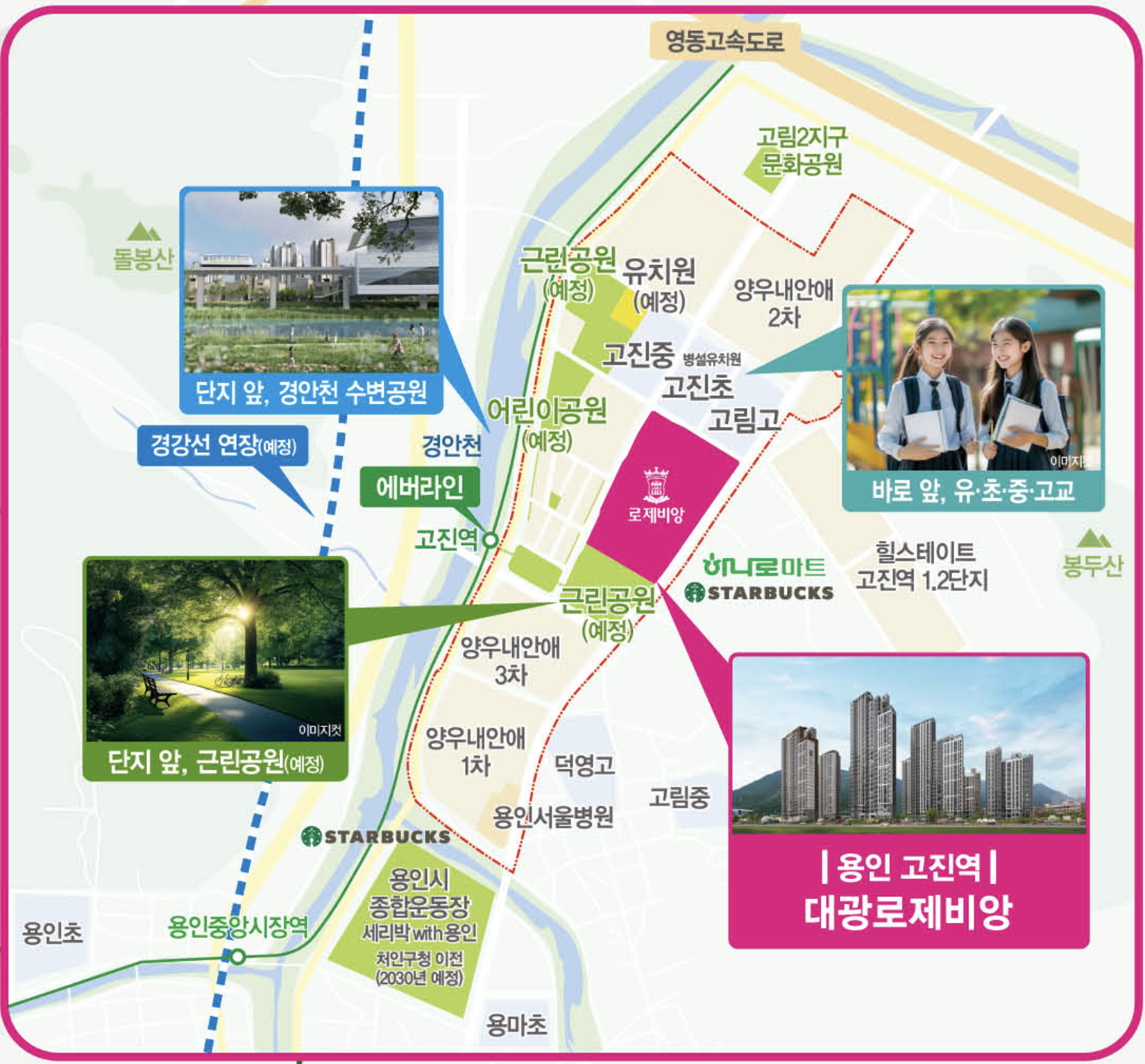 하나로마트, 롯데시네마, 용인서울병원, 용인종합운동장 등 생활 편의시설이 가까이 있으며, 처인구청 이전(예정)으로 행정 접근성도 향상될 예정입니다. 교육 환경은 고진초·고진중·고림고 등 초·중·고교가 모두 도보권에 위치해 있으며, 병설유치원 및 신규 유치원(예정)까지 인접해 있어 자녀 교육에 유리한 원스톱 학세권 입지를 갖추고 있습니다.
