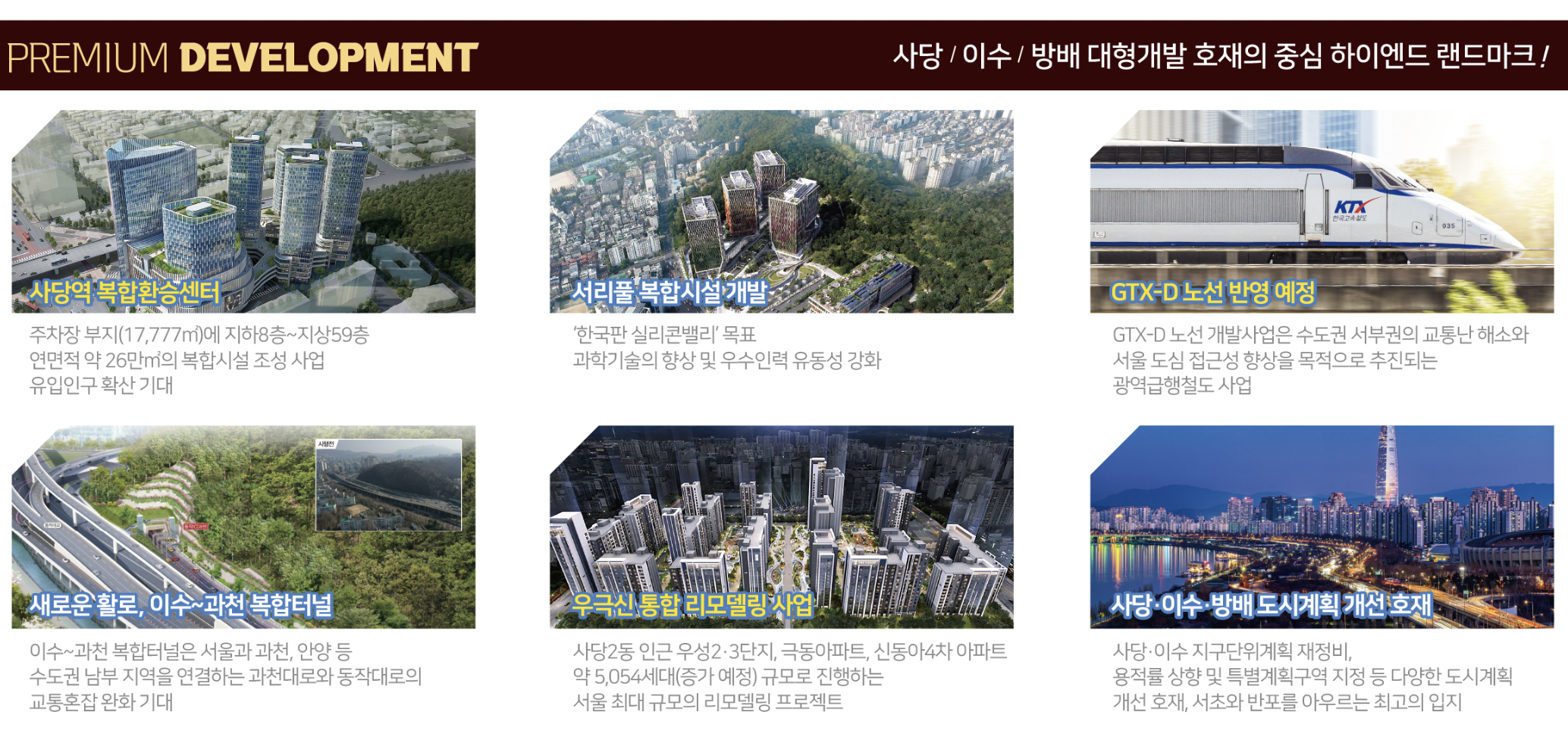 이수역을 도보로 이용할 수 있어 4·7호선 환승을 통한 강남·여의도·종로 이동이 수월합니다. 이수~과천 복합터널 개통 시 강남 접근성이 더욱 강화될 전망입니다. 사당역 복합환승센터 개발과 GTX-D 개통 기대감까지 더해져 향후 교통 인프라 가치가 더욱 높아질 환경을 갖추고 있습니다.