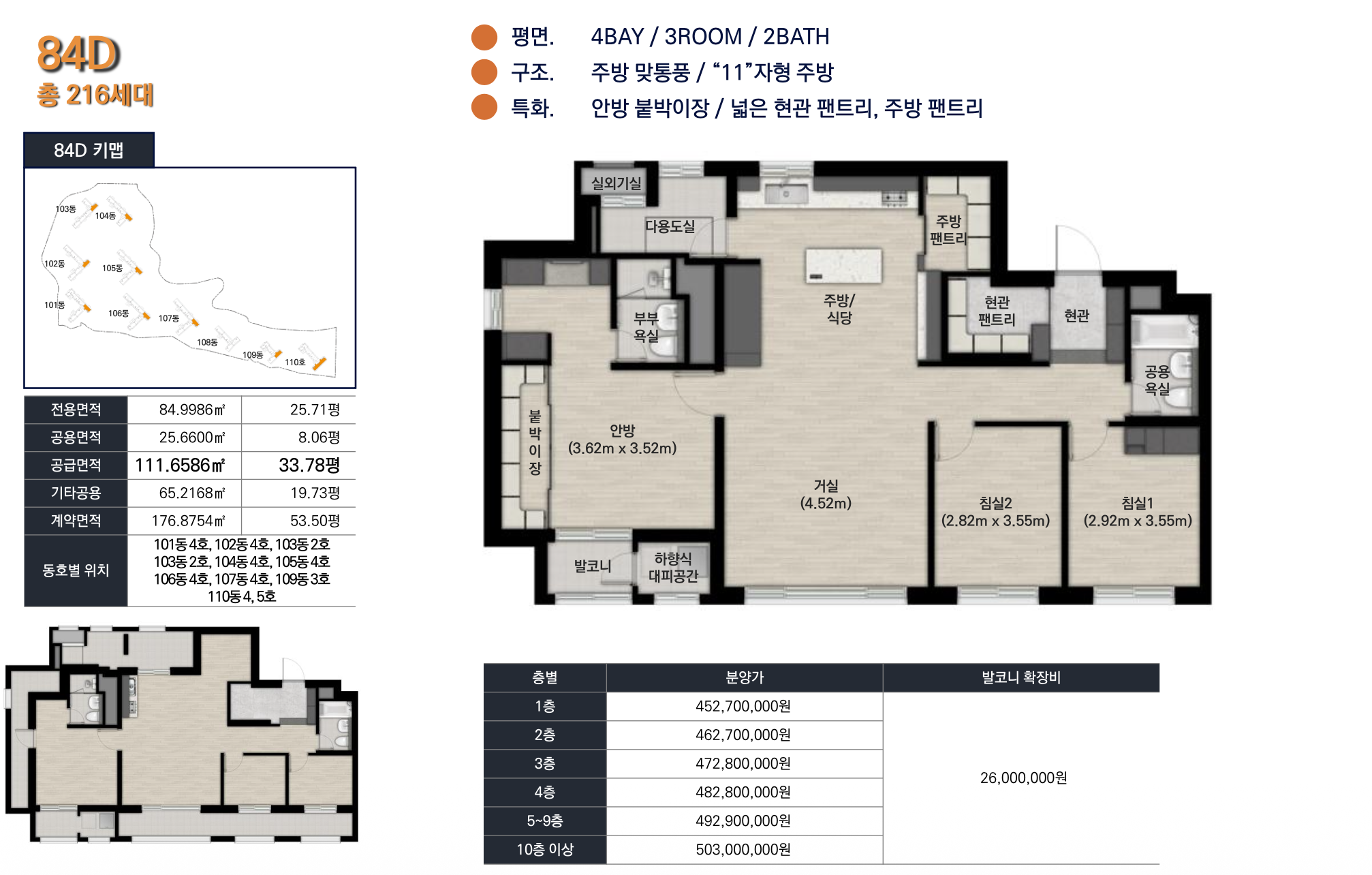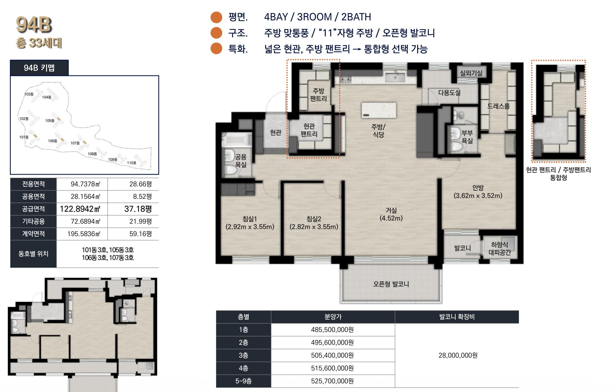 전용 84, 94, 101㎡ 중심의 실용적 중대형 배치가 적용되어 가족 단위의 선호도가 높습니다. 넓은 거실 중심 설계와 수납 강화형 구조가 특징이며 채광과 통풍이 고려된 쾌적한 공간 배치가 돋보입니다.