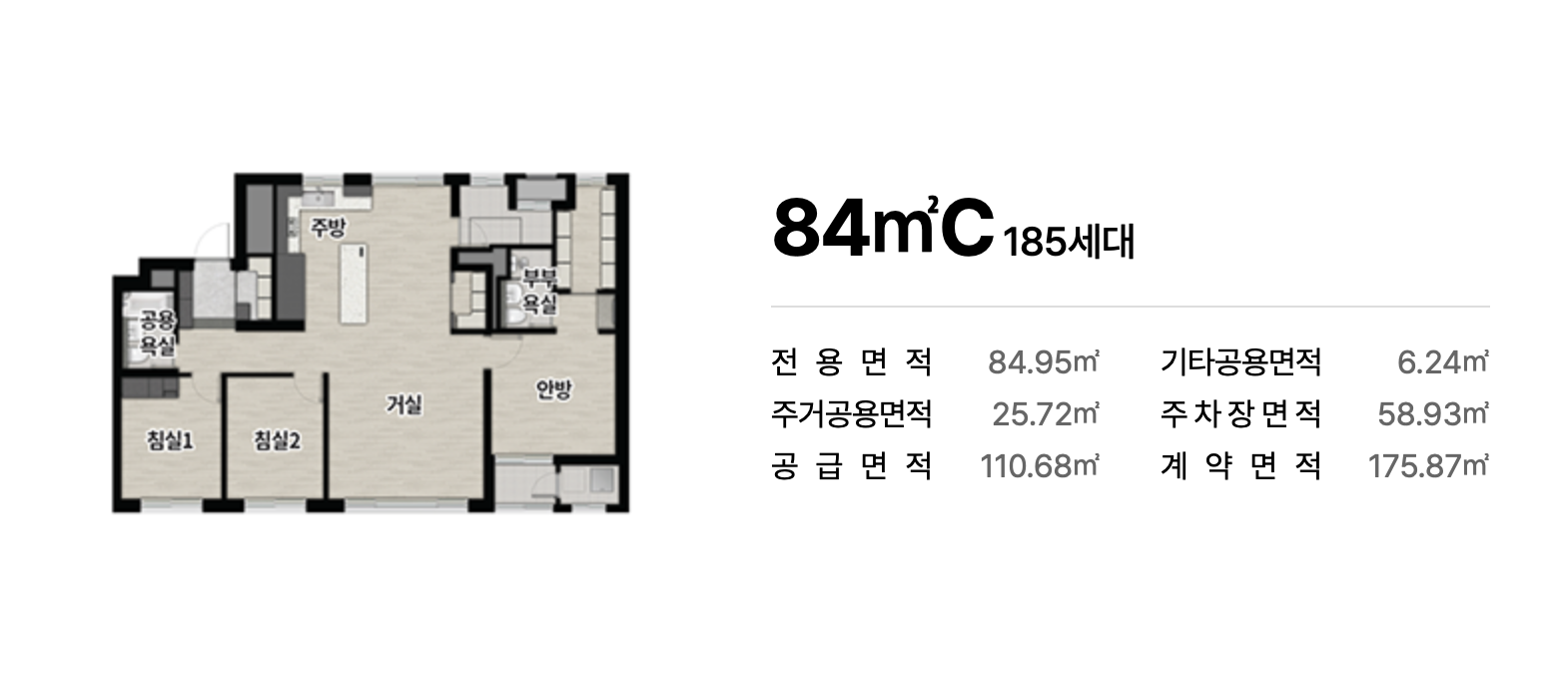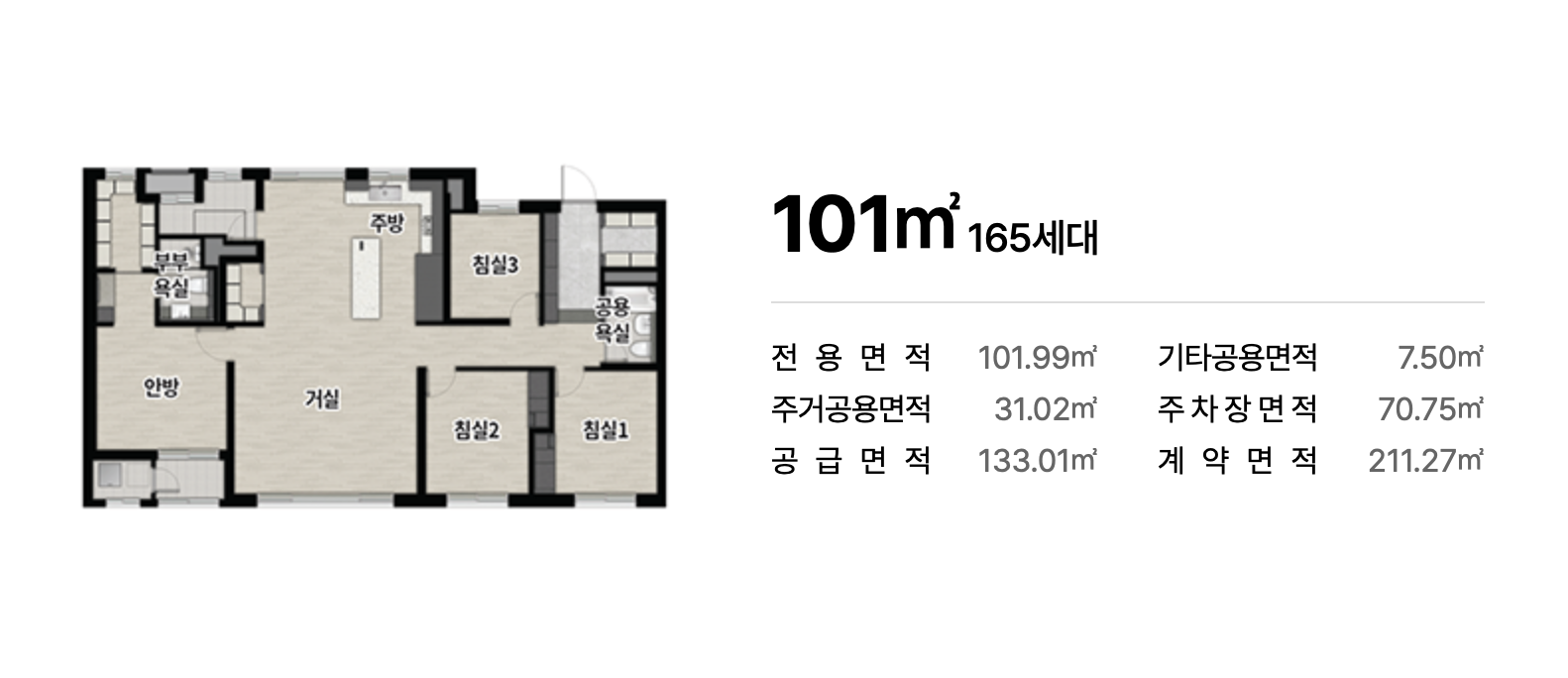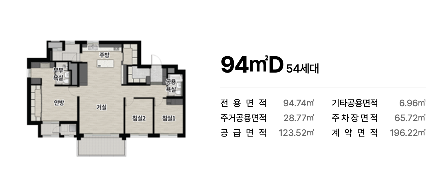 84, 94, 101㎡ 중심의 설계는 실내 공간 효율성과 동선 편의성을 고려한 구조입니다. 수납 효율이 높은 형태가 적용될 가능성이 있으며 세대당 1.5대 주차가 제공되어 차량 이용 편의성이 높습니다.
