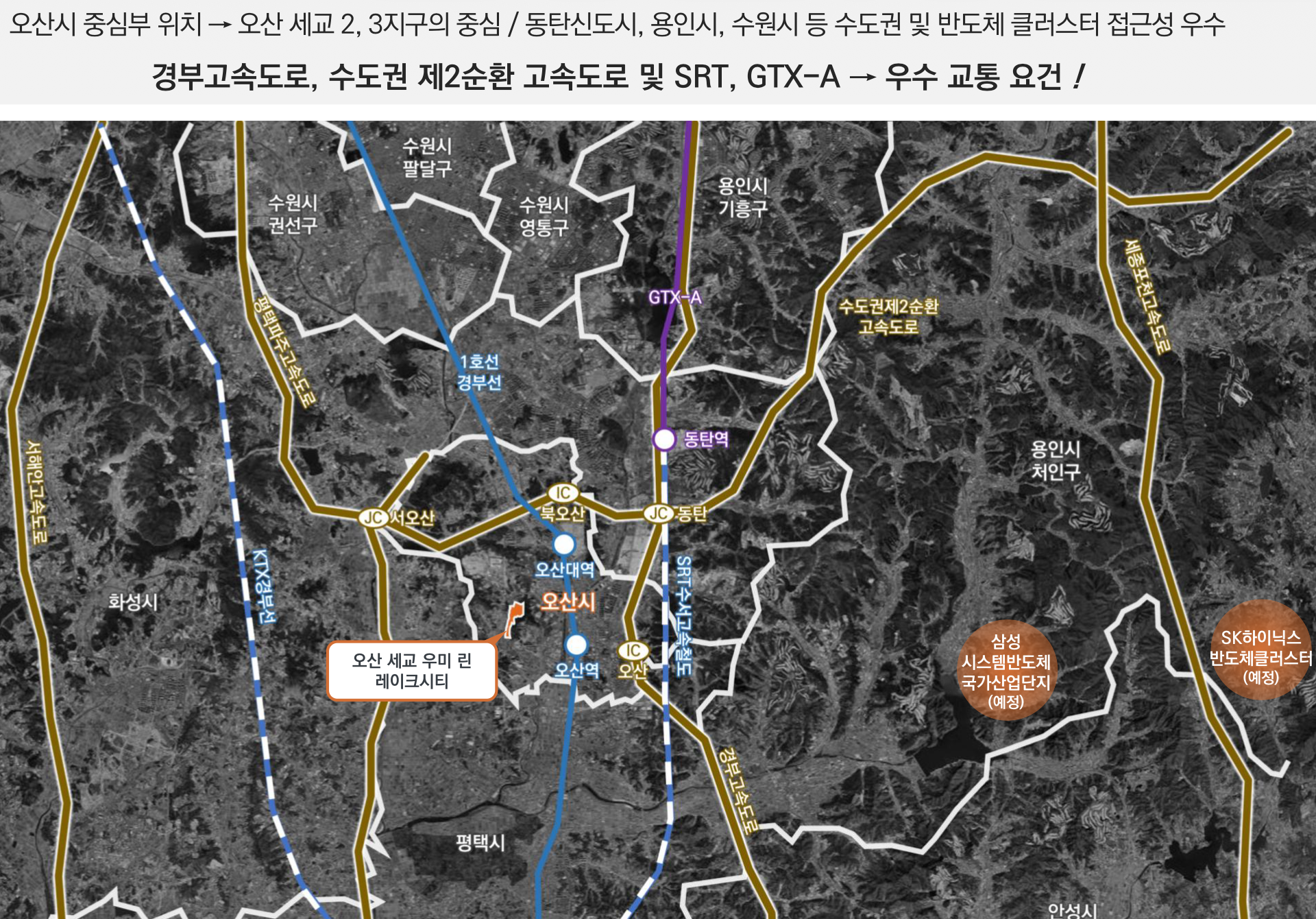 1호선 오산역 접근성이 우수해 출퇴근 이동에 용이합니다. GTX-C 노선 계획이 추진 중이며 동탄도시철도 트램 예정으로 향후 교통망 확장이 기대됩니다. 분당선 연장 논의까지 이어져 광역 교통 접근성도 점차 강화될 전망입니다.
