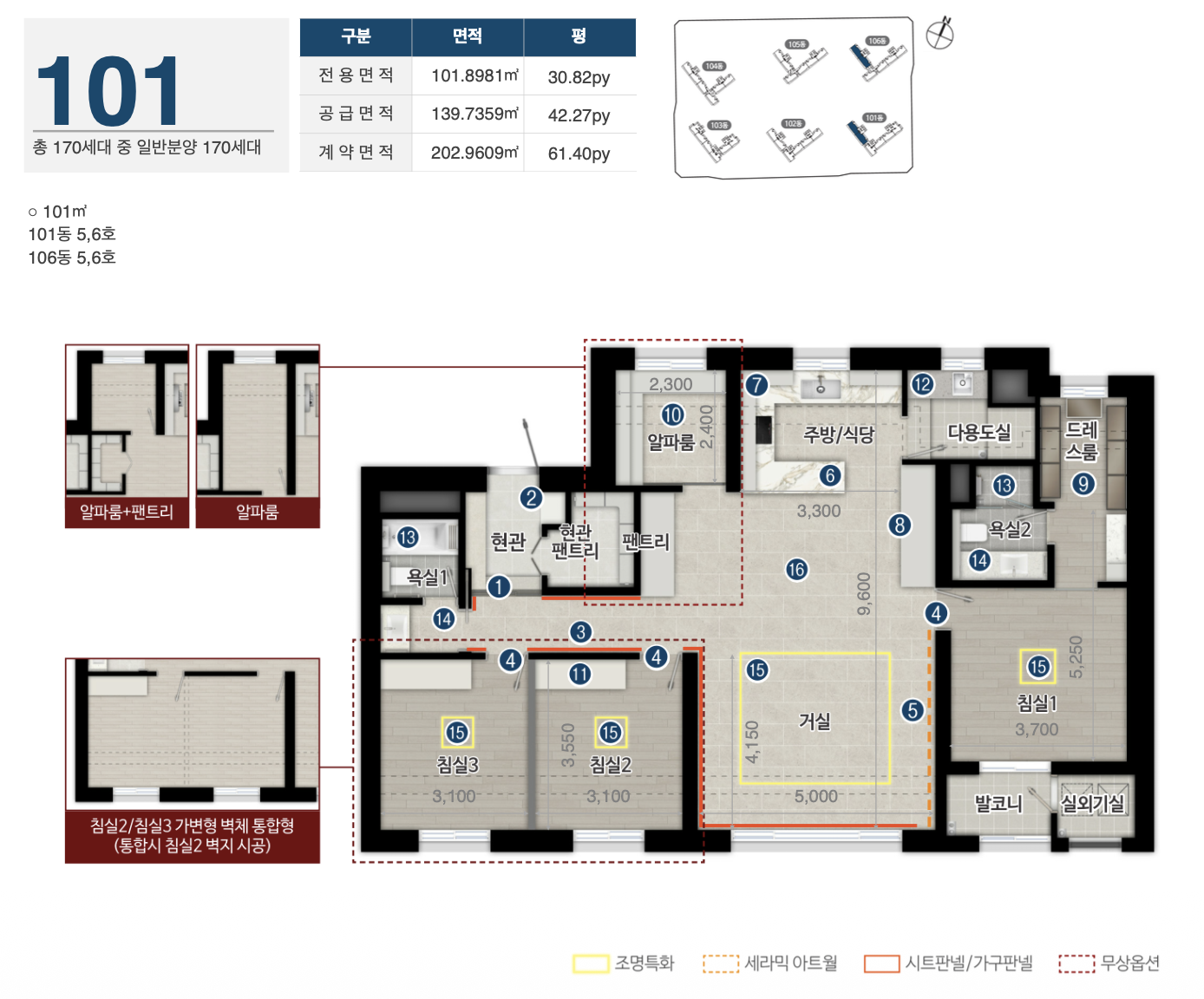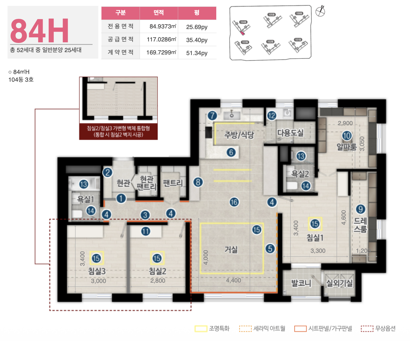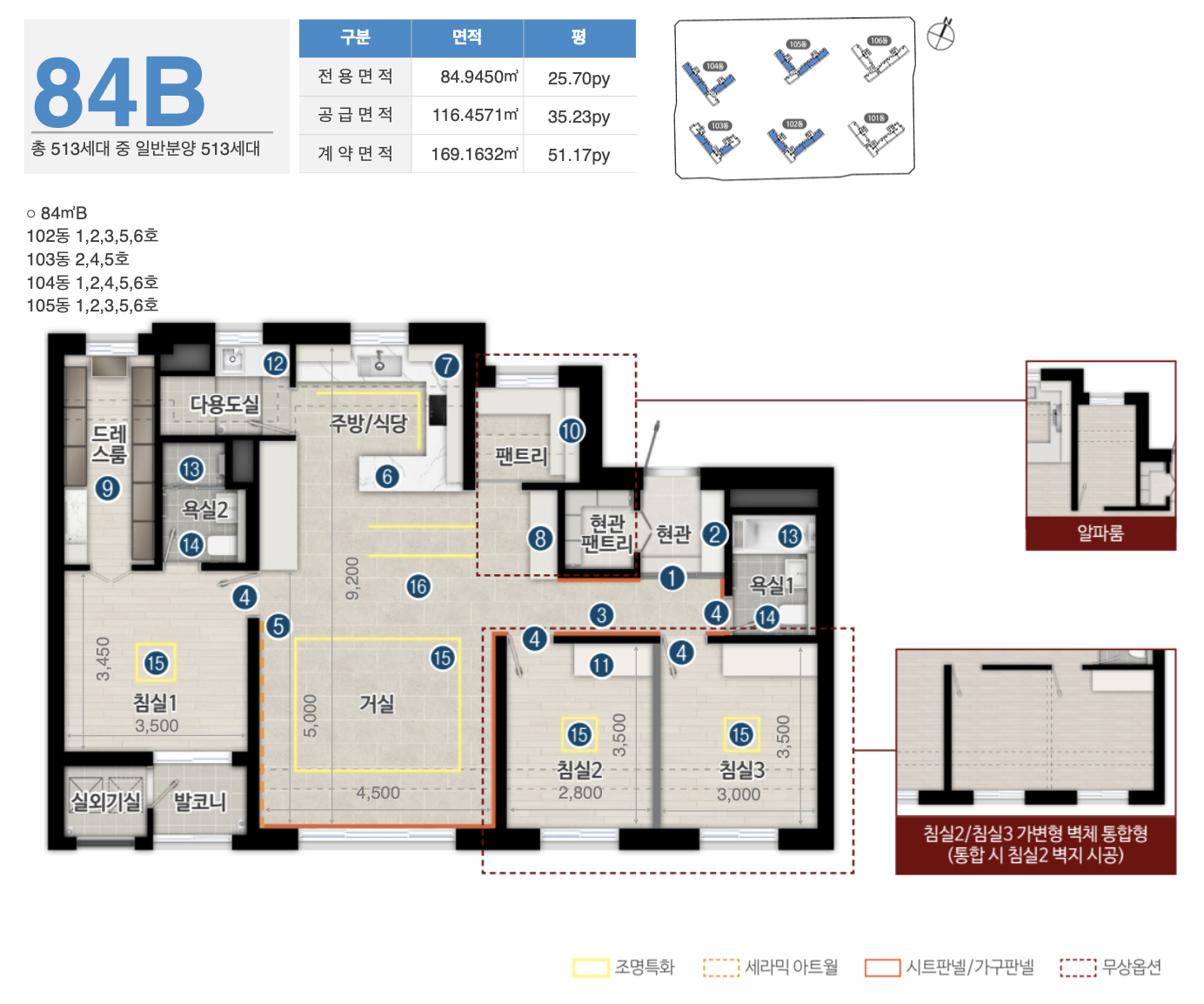 전체가 4베이 판상형 구조로 설계되어 채광과 통풍이 우수합니다. 팬트리, 알파룸, 드레스룸 등 다양한 수납 및 선택 요소가 적용돼 공간 효율성이 뛰어납니다. 가변형 벽체를 활용한 공간 변형도 가능하여 가족 구성 변화에도 유연하게 대응할 수 있습니다.