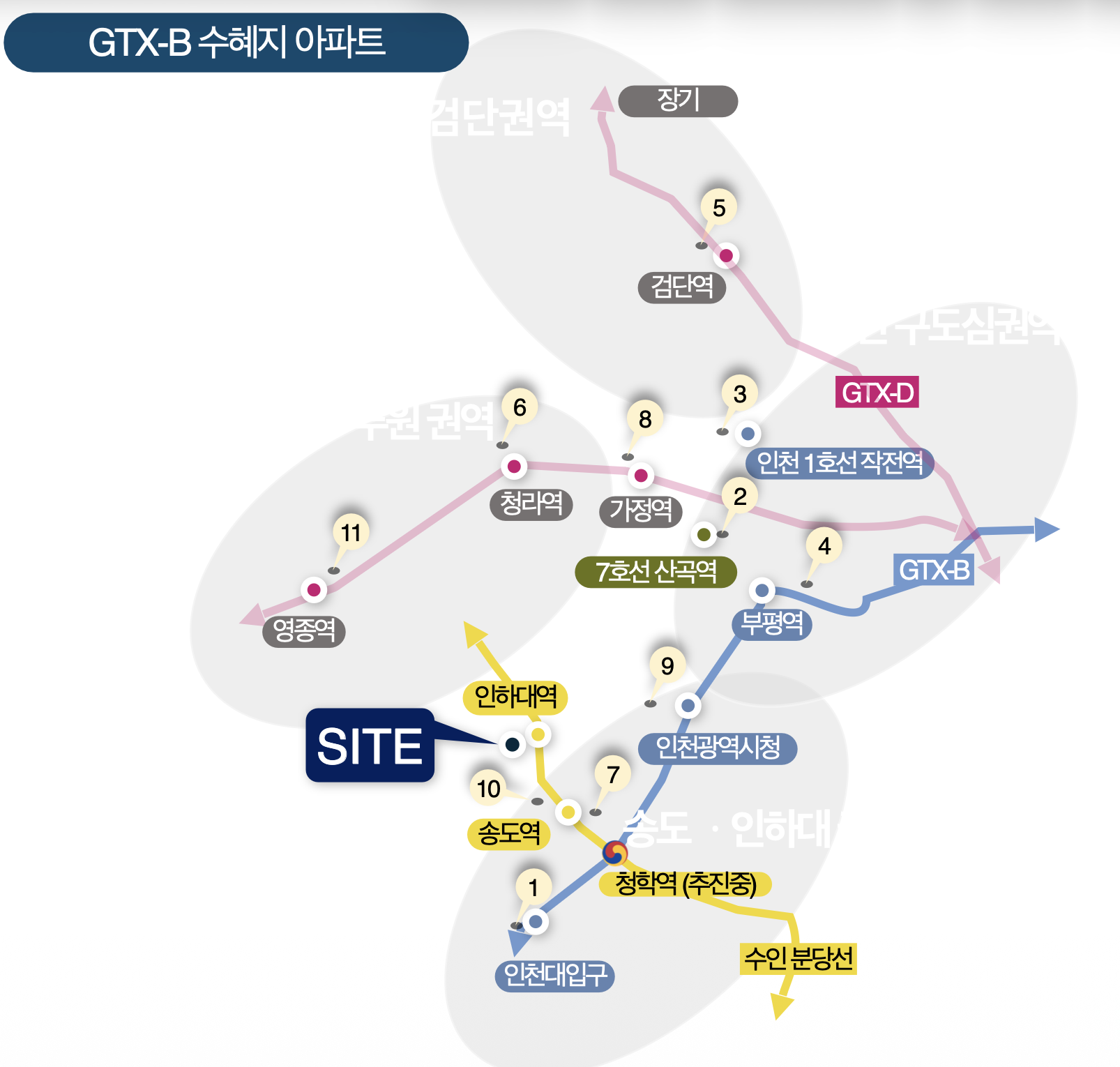 수인분당선 인하대역을 도보로 이용할 수 있어 출퇴근 접근성이 매우 뛰어납니다. 송도역에서는 인천발 KTX가 2026년 개통 예정이며 광역 이동성이 크게 확대됩니다. GTX-B 청학역(가칭) 추진으로 향후 서울 접근성도 한층 강화될 전망입니다.