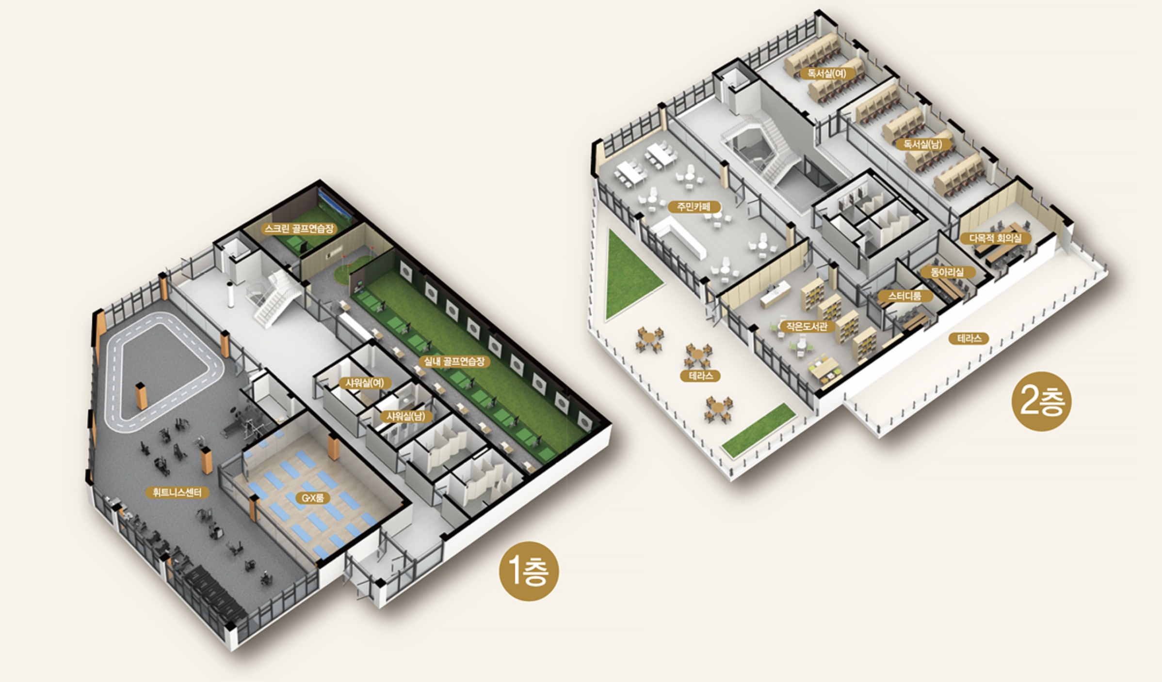 피트니스센터와 실내 골프연습장, 스크린골프장 등 운동 시설이 단지 내에 마련됩니다. 주민카페와 작은도서관, 스터디룸도 함께 조성돼 입주민의 여가와 학습 활동을 지원합니다.