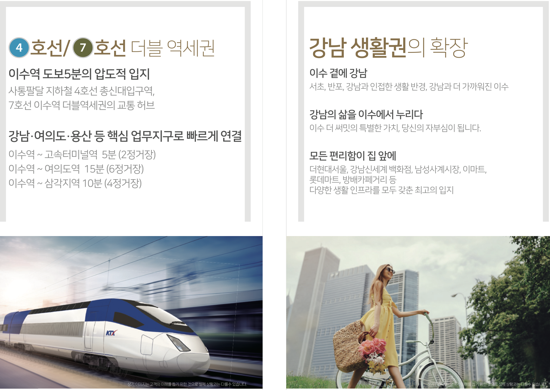 이수역은 4호선과 7호선을 모두 이용할 수 있어 서울 주요 업무지구 이동이 용이합니다. 사당역 복합환승센터 개발이 더해지며 대중교통 접근성은 앞으로 더욱 강화될 전망입니다. GTX-D 노선과 이수, 과천 복합터널 추진 효과 또한 기대되는 요소입니다.