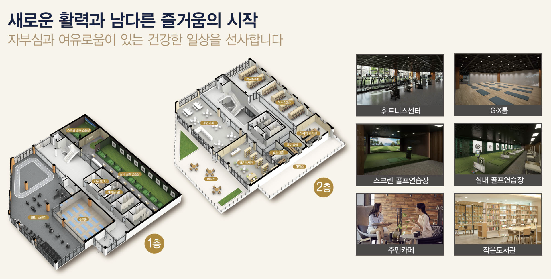 커뮤니티 시설로는 피트니스센터와 골프연습장, 스크린골프장이 마련돼 특별하고 다채로운 취미활동을 지원합니다. 주민카페와 작은도서관, 스터디룸이 함께 구성돼 일상 속 휴식과 학습을 단지 안에서 해결할 수 있도록 계획됐습니다.