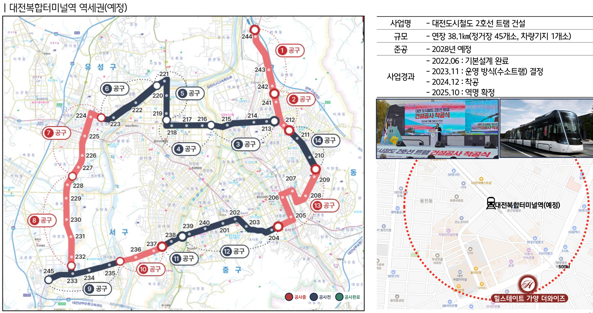 대전복합터미널과 가까운 위치로 시외 이동이 편리하며 도시철도 2호선 트램 노선 이용이 예정되어 있습니다. 동서대로와 한밭대로, 대덕대로를 따라 대전 도심과 주요 업무지구 접근이 가능하고 경부고속도로 대전IC와 호남고속도로지선 연결도 수월합니다.