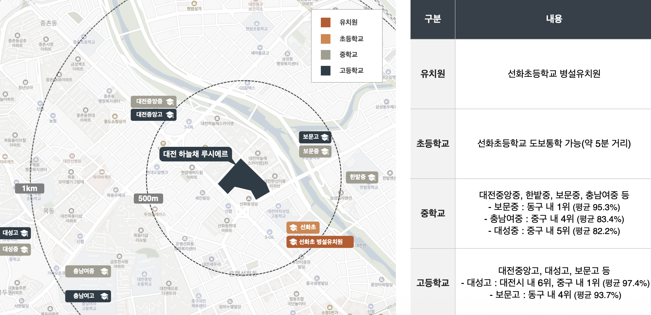 코스트코, 홈플러스, 이마트, 메가박스, 선병원, 카톨릭대학교 성모병원, 충남대학교병원, NC백화점, 대전세무서, 복지센터 등이 가까이 있어 생활에 불편함이 없습니다. 교육환경으로는 선화초, 한밭중, 충남여고, 보문중, 보문고, 대전중앙고, 충남여고 등이 마련되어 안심하고 통학할 수 있습니다.