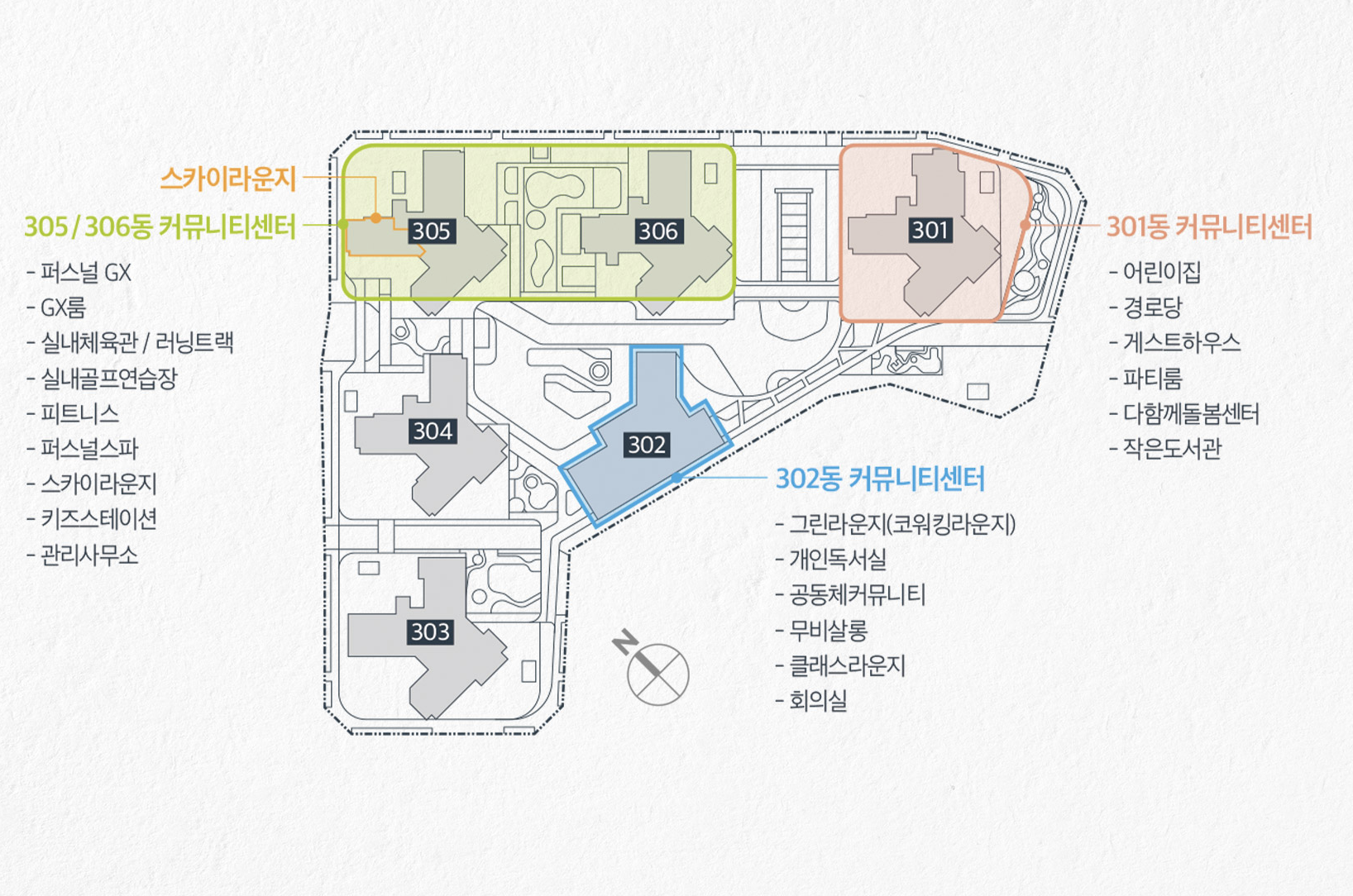 스카이라운지, 퍼스널 스파, 클래스라운지, 그린라운지, 다목적 실내체육관, 무비살롱, 피트니스클럽, 실내 골프연습장, 게스트하우스, 작은도서관, 어린이집, 파티룸, 다함께 돌봄센터 등을 자유롭게 이용할 수 있습니다.