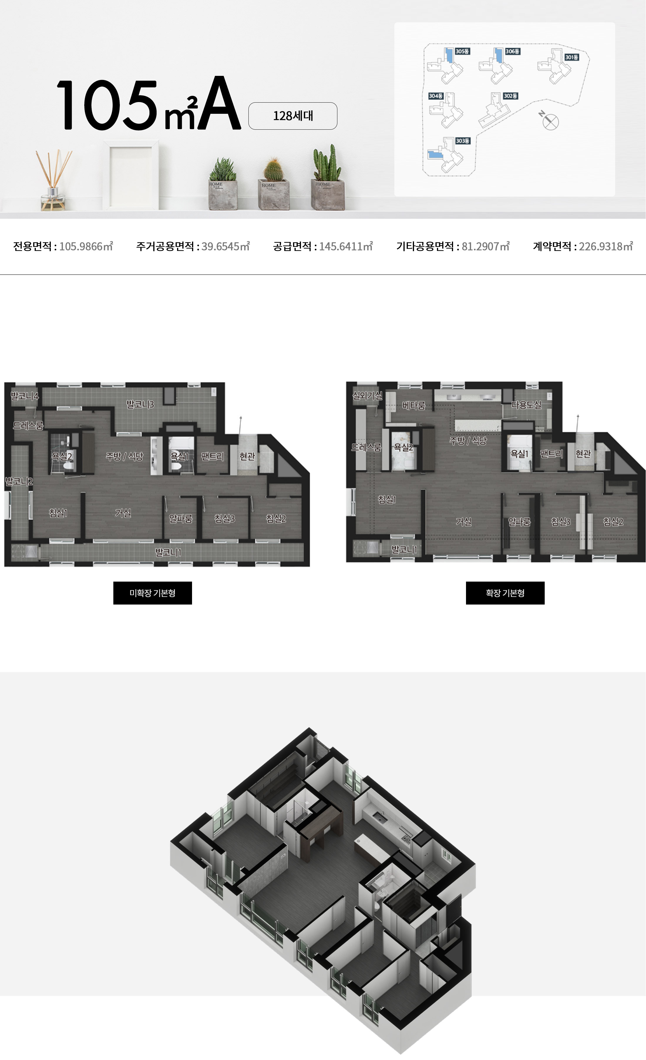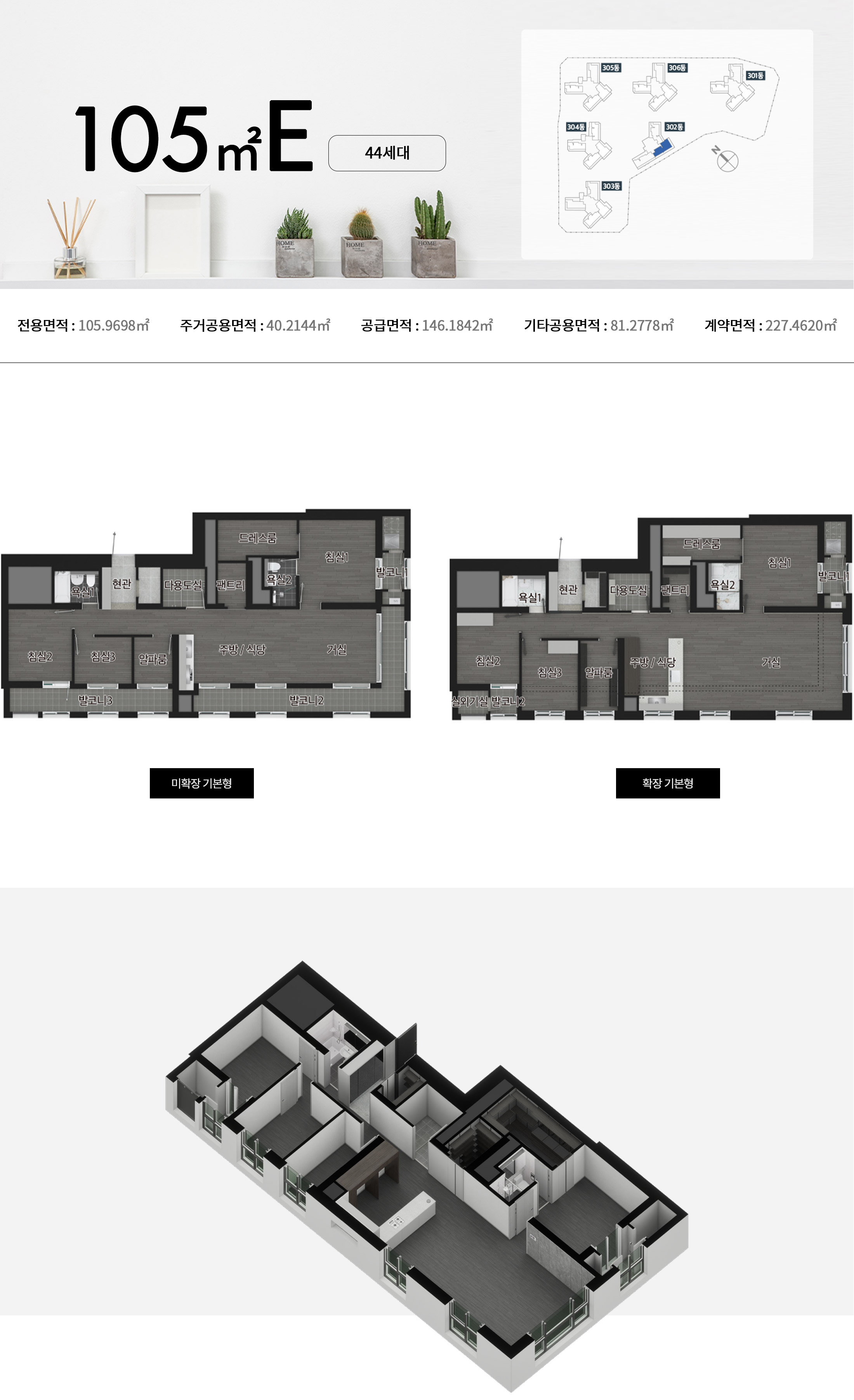 남향 위주의 단지 배치와 함께 4베이, 4.5베이, 5베이 특화 설계가 적용되었습니다. 드레스룸, 팬트리, 붙박이장, 현관창고 등 수납 공간이 다양하게 마련되어 실내 활용도가 높습니다.