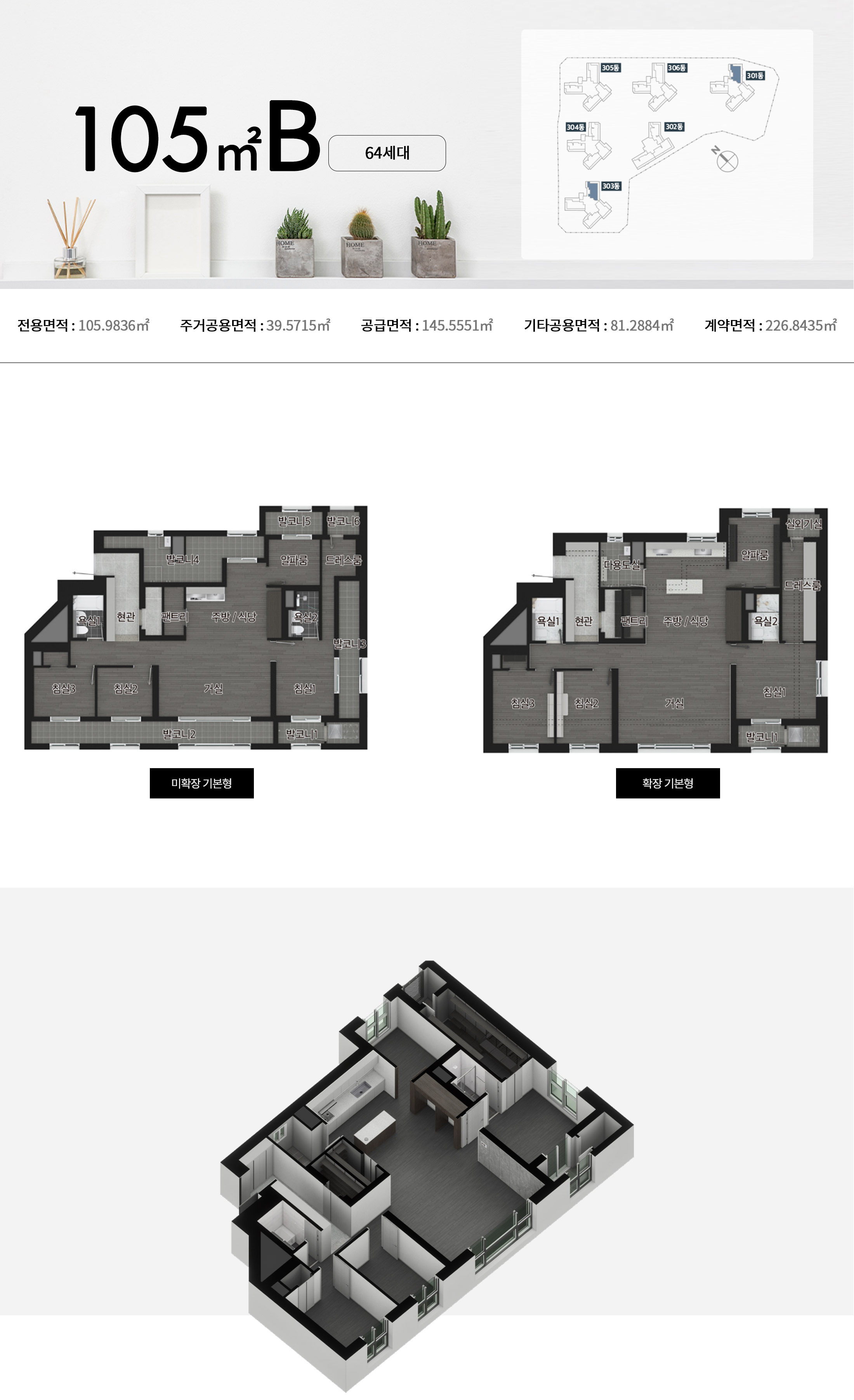 남향 위주의 단지 배치와 함께 4베이, 4.5베이, 5베이 특화 설계가 적용되었습니다. 드레스룸, 팬트리, 붙박이장, 현관창고 등 수납 공간이 다양하게 마련되어 실내 활용도가 높습니다.