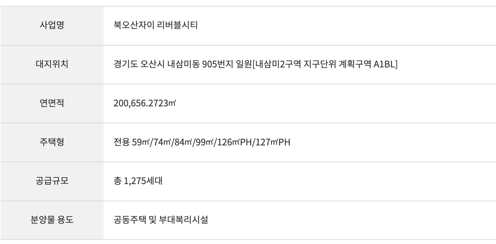 경기도 오산시 내삼미동 905번지 일원에 위치한 북오산 자이 리버블시티는 지하2층~지상29층, 10개동, 전용면적 59~127㎡, 총 1,275세대로 조성되었습니다. 2029년 3월 입주예정에 있는 북오산 자이 리버블시티는 미분양 잔여세대에 대하여 선착순 계약을 실시하고 있습니다.