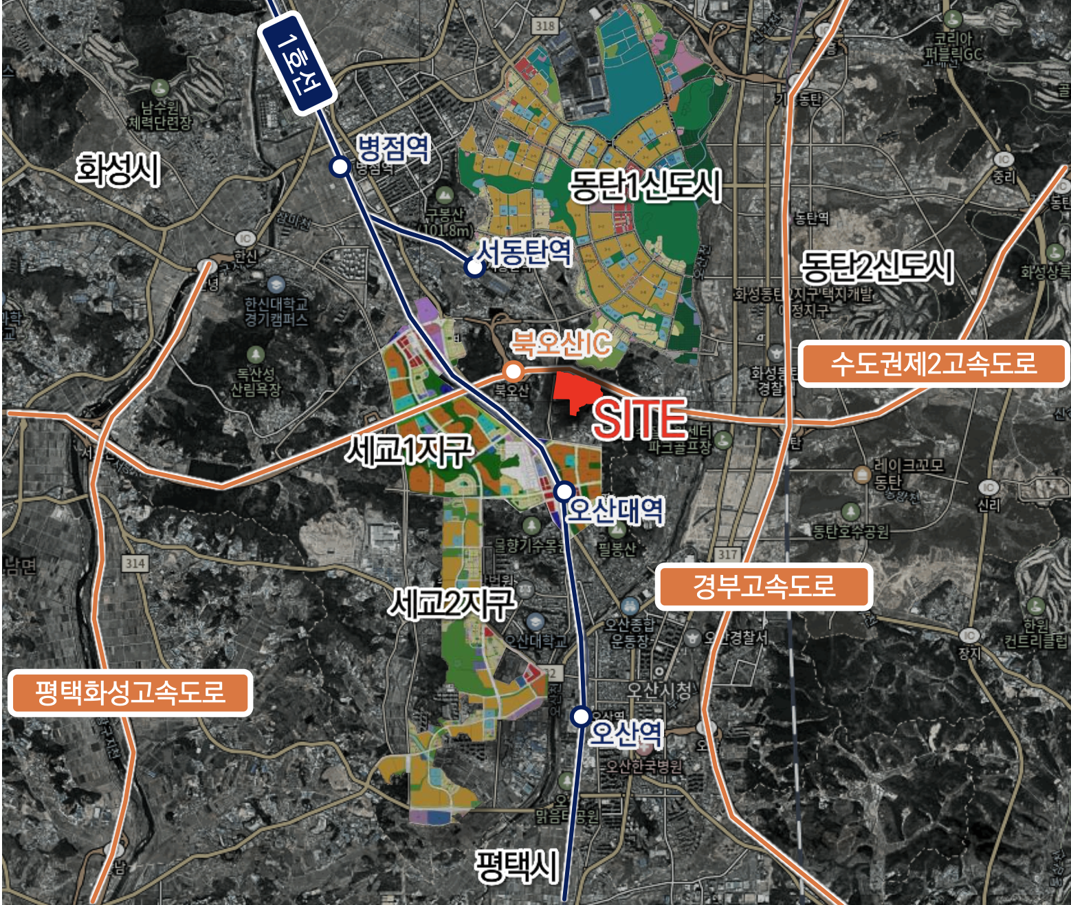 지하철1호선 오산대역과 세마역을 편리하게 이용할 수 있고 수도권제2순환고속도로(봉담~동탄), 북오산IC, 경부고속도로, 필봉터널 등으로 서울과 수원, 용인 등 수도권 주요도심으로 빠르게 이동할 수 있습니다.